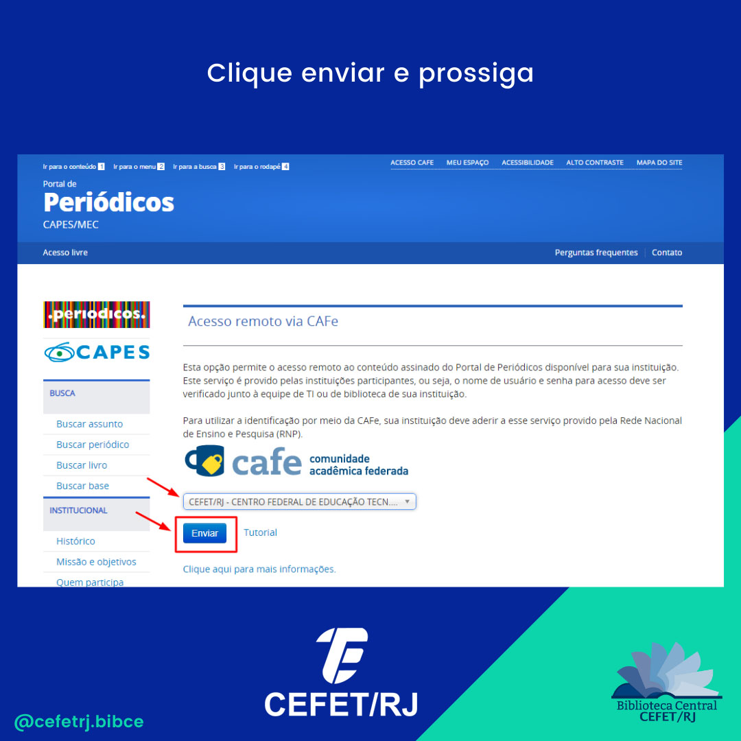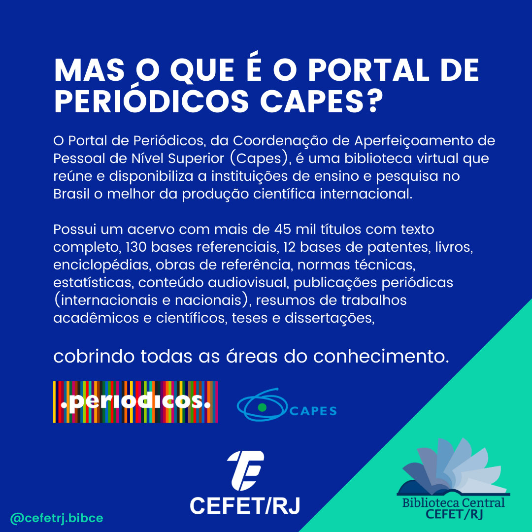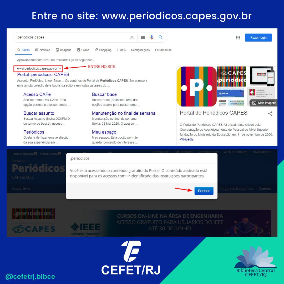 A Biblioteca Central do Cefet/RJ preparou um tutorial com os procedimentos para quem deseja acessar remotamente o Portal de Periódicos CAPES. Alunos, servidores docentes e técnico-administrativos do Cefet/RJ têm acesso livre e gratuito a todo o conteúdo do portal, basta fazer o login utilizando o CPF e a senha do e-mail institucional.