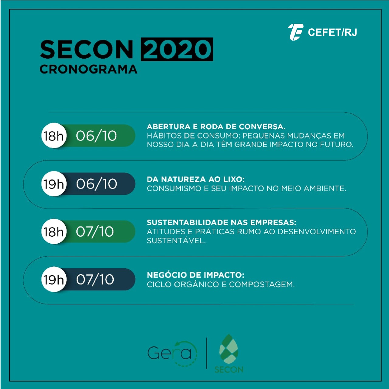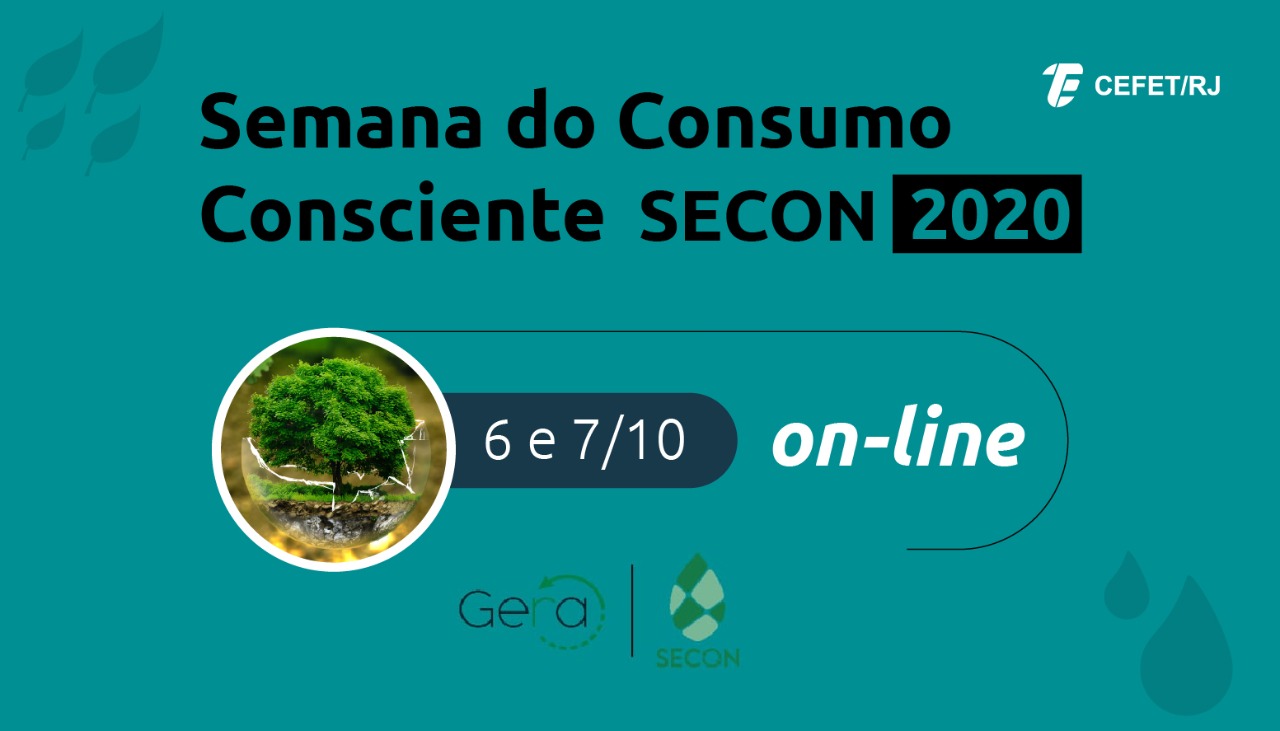 Com a proposta de debater medidas importantes para a conservação do meio ambiente, o Cefet/RJ promove, entre os dias 6 e 7 de outubro, a Semana de Consumo Consciente (SECON 2020). Em virtude das ações de combate à proliferação do coronavírus, o evento será realizado on-line pelo YouTube, com palestras e rodas de conversa, das 18h às 20h. A SECON irá disponibilizar certificado aos participantes que permanecerem até o fim da programação.
