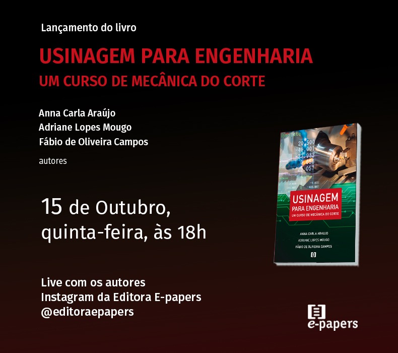 No dia 15 de outubro, Dia do Professor, a editora E-papers promoverá uma live em sua conta do instagram, às 18 horas, para promover o lançamento do livro Usinagem para Engenharia – um curso de mecânica do corte. A editora chefe da E-papers irá conversar com os autores Anna Carla Araujo (INSA Toulouse/França), Adriane Lopes Mougo (Cefet/RJ) e Fábio de Oliveira Campos (Cefet/RJ) sobre a importância dessa contribuição para a formação de novos engenheiros.