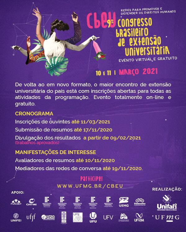 A Diretoria de Extensão (DIREX) e o Departamento de Extensão e Assuntos Comunitários (DEAC) divulgam, para toda a comunidade do Cefet/RJ, o 9º Congresso Brasileiro de Extensão Universitária (CBEU), organizado pela UFMG e pela UNIFAL, que será realizado nos dias 10 e 11 de março de 2021.