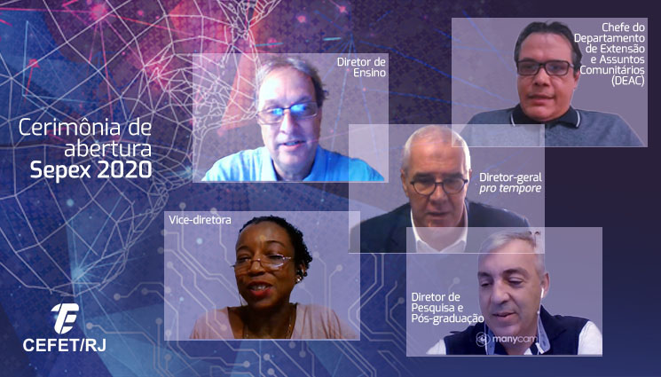 Em cerimônia on-line que ocorreu hoje (23), foi realizada a abertura oficial da Semana de Ensino, Pesquisa e Extensão (Sepex) 2020 do Cefet/RJ. Participaram da abertura do evento o diretor-geral pro tempore Antônio Maurício Castanheira das Neves, a vice-diretora Silvia Cristina Rufino, o diretor de Ensino Francisco Madureira de Avila Pires, a diretora de Extensão Sônia Regina Mendes dos Santos, o diretor de Pesquisa e Pós-graduação Wladmir Henriques Motta e o chefe do Departamento de Extensão e Assuntos Comunitários (DEAC), André Alexandre Guimarães Couto. O cerimonial foi conduzido pela servidora Simone Regina de Oliveira Ribeiro.