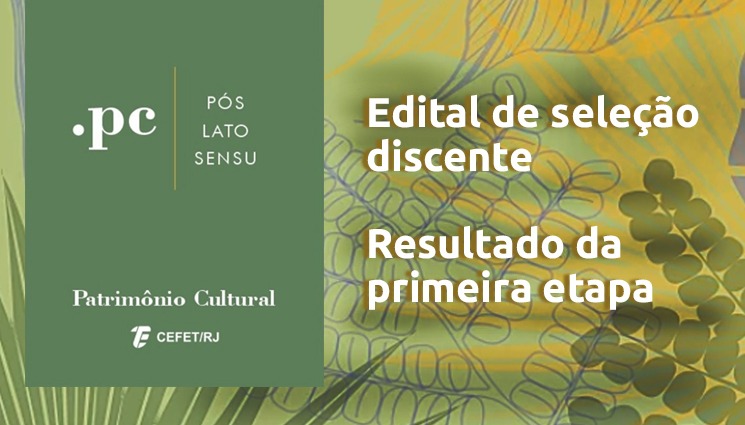 A Diretoria de Pesquisa e Pós-graduação (DIPPG) do Cefet/RJ, por meio da Coordenação Geral de Cursos Lato Sensu (CGLAT), informa que estão disponíveis para consulta as notas da primeira etapa do processo seletivo para o curso de pós-graduação em Patrimônio Cultural. A relação de candidatos classificados na análise curricular e na avaliação da carta de interesse está disponível no site do curso: http://www.pospatrimoniocultural.com/edital-2021.