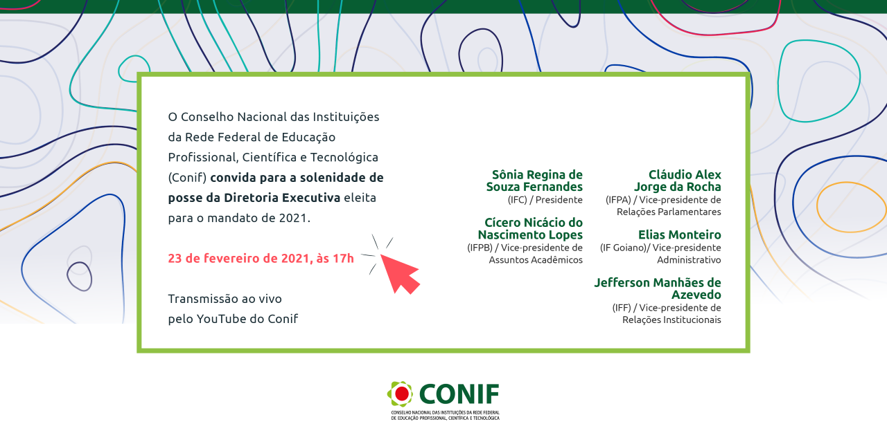 Gestores, estudantes, servidores e toda a comunidade acadêmica da Rede Federal estão convidados para acompanhar a posse da nova Diretoria Executiva do Conselho Nacional das Instituições da Rede Federal de Educação Profissional, Científica e Tecnológica (Conif), nessa terça-feira (23/2), às 17h. Pela primeira vez, o evento acontece em formato totalmente digital e será transmitida na página oficial do Conif no YouTube.