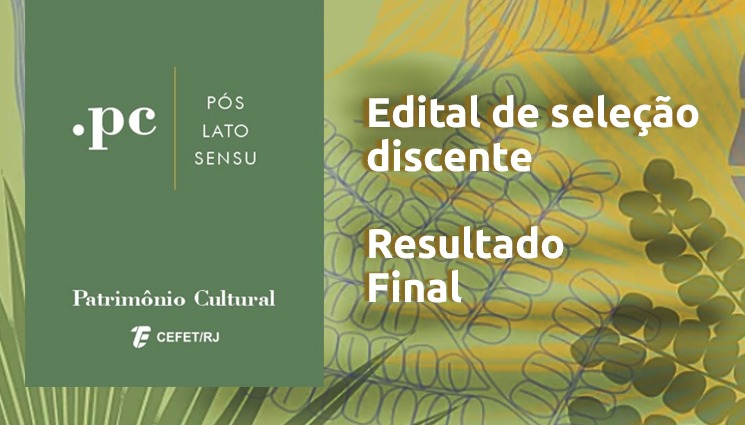 A Diretoria de Pesquisa e Pós-graduação (DIPPG) do Cefet/RJ, por meio da Coordenação Geral de Cursos Lato Sensu (CGLAT), divulgou nesta segunda-feira (01/03) o resultado final do processo seletivo para o curso de pós-graduação em Patrimônio Cultural. A relação de candidatos classificados e a nota final de cada participante do processo seletivo está disponível no site http://www.pospatrimoniocultural.com/edital-2021.