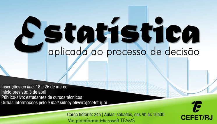 Com início previsto para 3 de abril, o Cefet/RJ ofertará o curso de extensão “Estatística Aplicada ao Processo de Decisão”. As inscrições on-line estão abertas até o dia 26 de março e poderão ser realizadas por alunos dos cursos técnicos do Cefet/RJ (integrados ao ensino médio, subsequentes e EAD) e por estudantes de outras instituições de ensino. Os encontros on-line serão realizados aos sábados, das 9h às 10h30, pelo aplicativo Microsoft Teams. A carga horária é de 24 horas e será preenchida por aulas e atividades assíncronas.