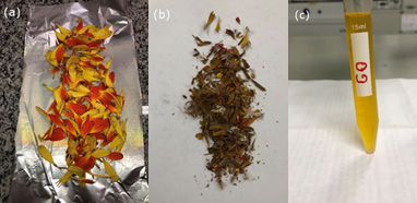 Processo para preparo de células solares orgânicas: pétalas de flores (a) passam por secagem (b) antes de serem colocadas em álcool para obtenção do corante natural usado nas pesquisas (Foto: Divulgação)