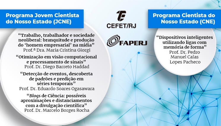 Cinco professores do Cefet/RJ tiveram projetos de pesquisa selecionados nos programas Cientista do Nosso Estado (CNE) e Jovem Cientista do Nosso Estado (JCNE), da FAPERJ, conforme resultado divulgado ontem (13) no site da Fundação.