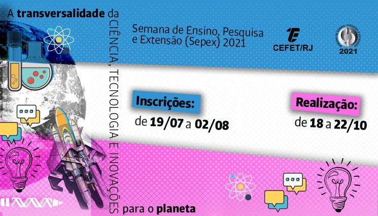 Com o tema “A transversalidade da ciência, tecnologia e inovações para o planeta”, será realizada, entre os dias 18 e 22 de outubro, a Semana de Ensino, Pesquisa e Extensão (Sepex) 2021 do Cefet/RJ. Em virtude da pandemia, o evento ocorrerá de forma virtual e unificada nos oito campi da instituição. As inscrições são gratuitas e deverão ser realizadas de 19 de julho até o dia 02 de agosto.