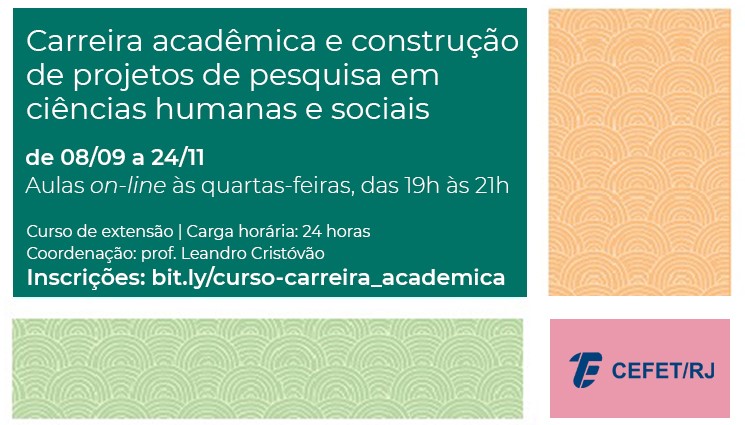As inscrições devem ser realizadas pelo link bit.ly/curso-carreira_academica. O formulário será desabilitado assim que o total de vagas for preenchido. Ao todo, estão sendo ofertadas 40 vagas. A iniciativa é uma atividade coordenada e desenvolvida pelo professor Leandro Cristóvão, por meio do Departamento de Extensão e Assuntos Comunitários (DEAC) do Cefet/RJ.