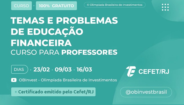 O curso é gratuito e abordará oito temas ligados à educação financeira, finanças e investimentos. O vídeo da primeira aula, realizada em 16/02, está disponível para visualização no canal da Olimpíada Brasileira de Investimentos (OBInvest) no YouTube. As inscrições seguem abertas para os próximos três encontros, que serão transmitidos nos dias 23/02, 09/03 e 16/03, a partir das 19h, pelo mesmo canal.