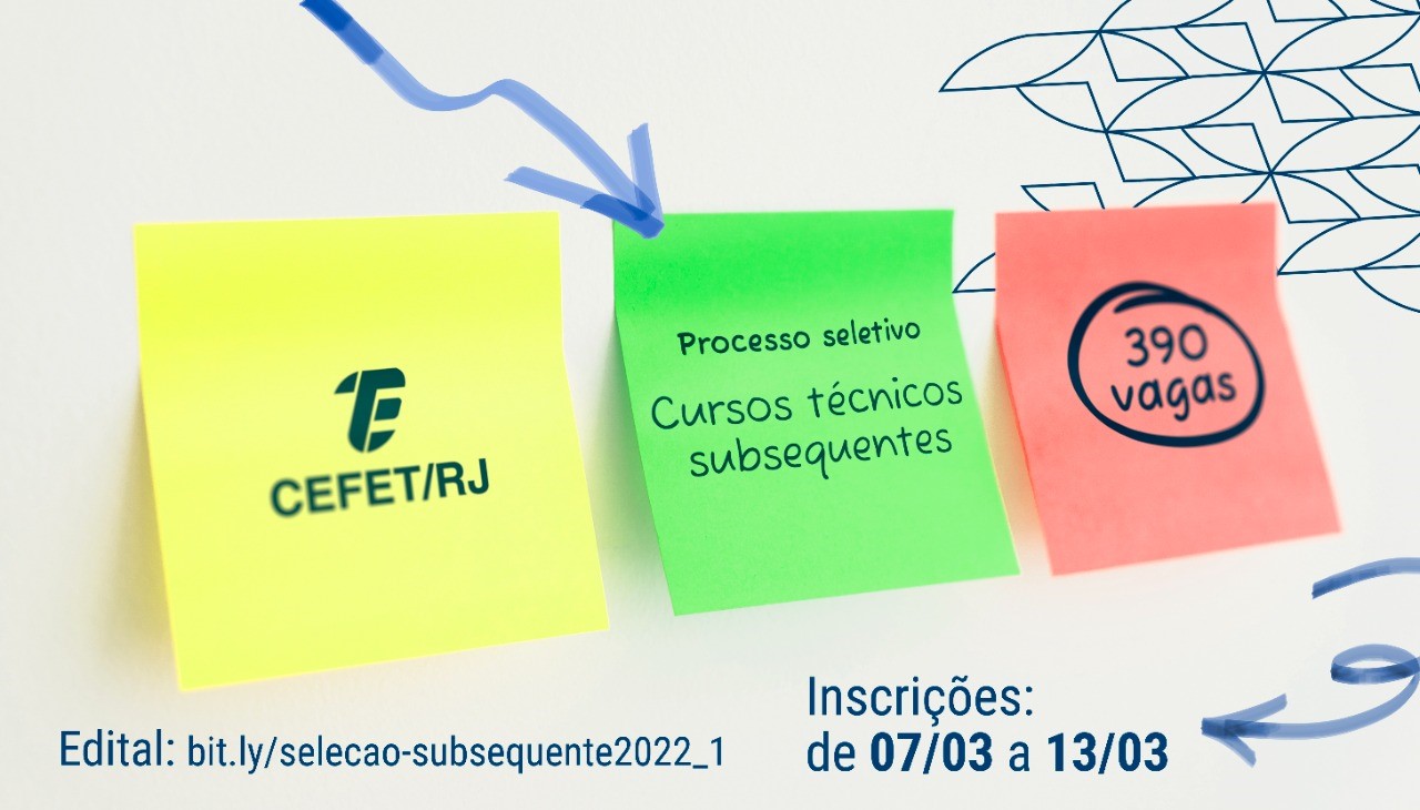 O Cefet/RJ disponibilizou, nesta sexta-feira (4), o edital referente ao processo seletivo para os cursos técnicos subsequentes de nível médio. Ao todo, são oferecidas 390 vagas distribuídas em cursos da Unidade Maracanã e das Uneds Maria da Graça e Itaguaí. As inscrições são gratuitas e devem ser feitas exclusivamente pela internet, das 9h do dia 07/03 (segunda-feira) até as 15h do dia 13 de março. O edital é referente ao primeiro semestre letivo de 2022.