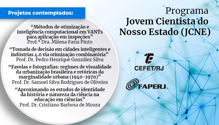 Quatro docentes do Cefet/RJ tiveram seus projetos contemplados no edital Jovem Cientista do Nosso Estado (JCNE) da FAPERJ. O resultado foi divulgado na última quinta-feira (10) no site da fundação. Confira, abaixo, a lista dos projetos do Cefet/RJ selecionados no edital.