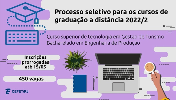 O Cefet/RJ está com inscrições abertas, até o dia 15 de maio (domingo), para o processo seletivo destinado ao ingresso em cursos superiores de educação a distância (EAD), na modalidade semipresencial, no âmbito do Consórcio Cederj. Foram abertas 450 vagas, sendo 250 para o curso superior de tecnologia em Gestão de Turismo e 200 para o bacharelado em Engenharia de Produção, ofertadas em diversos polos no estado do Rio de Janeiro. As vagas são referentes ao segundo semestre de 2022.