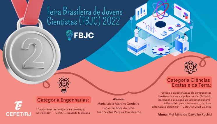 Dois projetos de pesquisa de alunos da educação profissional técnica de nível médio do Cefet/RJ conquistaram a segunda colocação nas categorias Engenharias e Ciências Exatas e da Terra na Feira Brasileira de Jovens Cientistas (FBJC). A terceira edição da feira, realizada nos dias 23 a 26 de junho de forma virtual, contou com a participação de estudantes de ensino médio de todo o país.