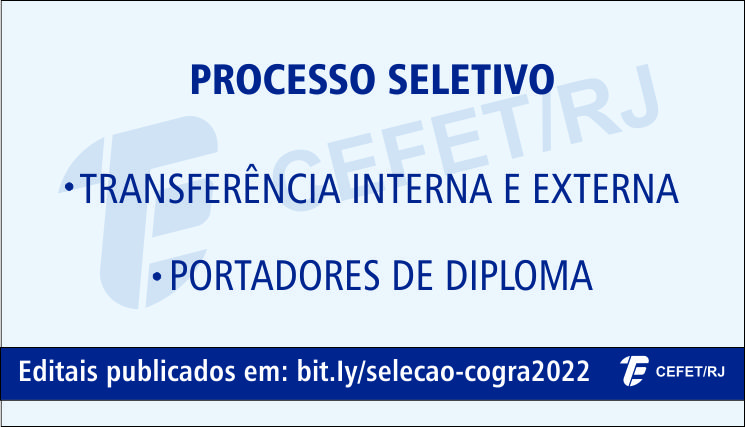 O Cefet/RJ disponibilizou, nesta terça-feira (5), três editais que têm por objetivo preencher vagas em cursos superiores da instituição por meio de transferência interna e externa e por seleção de candidatos diplomados. Todos os processos seletivos são relativos ao segundo período letivo de 2022. Confira os detalhes: