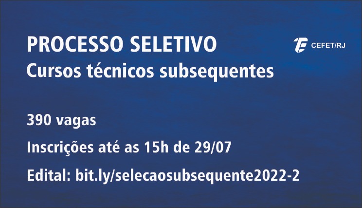 Estão abertas, até as 15h do dia 29 de julho, as inscrições para 390 vagas em cursos técnicos subsequentes do Cefet/RJ. As oportunidades são para o segundo semestre de 2022 e estão distribuídas entre ampla concorrência e oito modalidades de cotas. As inscrições são gratuitas e deverão ser realizadas exclusivamente via internet pelo site https://processoseletivo.cefet-rj.br/. Para participar do certame, é necessário ter o ensino médio completo.