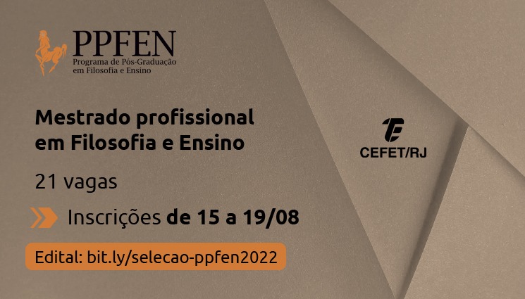 O Cefet/RJ disponibilizou para consulta o edital do curso de mestrado profissional do Programa de Pós-Graduação em Filosofia e Ensino (PPFEN) para ingresso em 2022. Ao todo, o processo seletivo abre 21 vagas, sendo metade delas reservada a negros e indígenas. Também haverá sistema de cotas para pessoas com deficiência e pessoas trans. As inscrições poderão ser realizadas entre os dias 15 e 19 de agosto, pelo site https://processoseletivo.cefet-rj.br/.