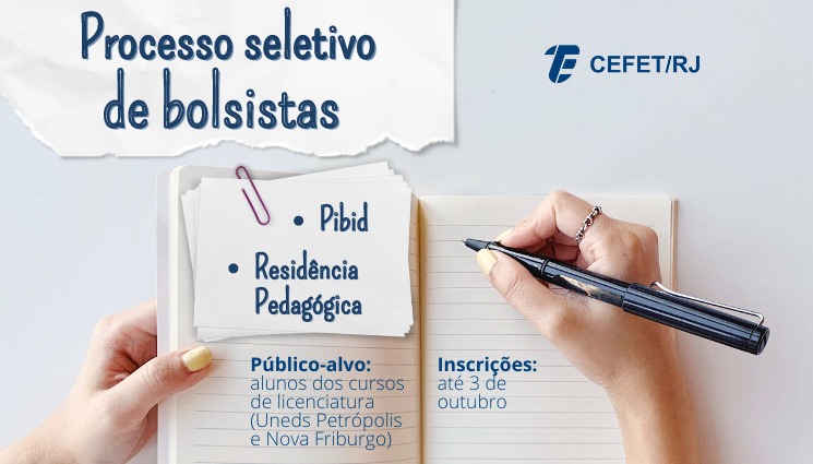 Estão abertas, até o dia 3 de outubro, as inscrições para bolsista do Programa Institucional de Bolsa de Iniciação à Docência (Pibid) e do Programa de Residência Pedagógica do Cefet/RJ. Os processos seletivos são voltados para alunos das licenciaturas em Física e em Matemática da Uned Petrópolis e do curso de licenciatura em Física da Uned Nova Friburgo. Saiba mais sobre cada programa abaixo.