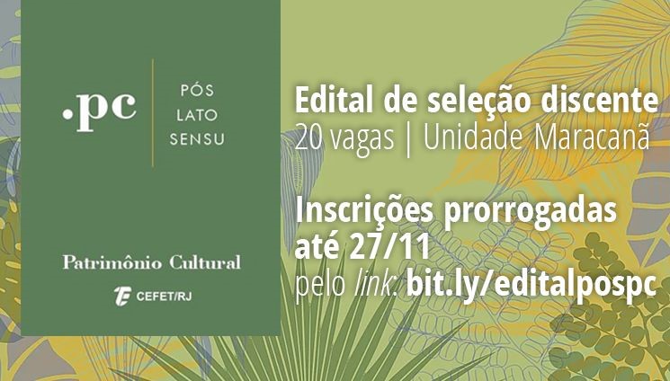 A Diretoria de Pesquisa e Pós-Graduação (DIPPG) do Cefet/RJ, por meio da sua Coordenadoria Geral dos Cursos de Pós-Graduação Lato Sensu (CGLAT), informa que as inscrições para o edital de seleção discente para o curso de Pós-Graduação Lato Sensu em Patrimônio Cultural foram prorrogadas até o dia 27/11, às 23h59.