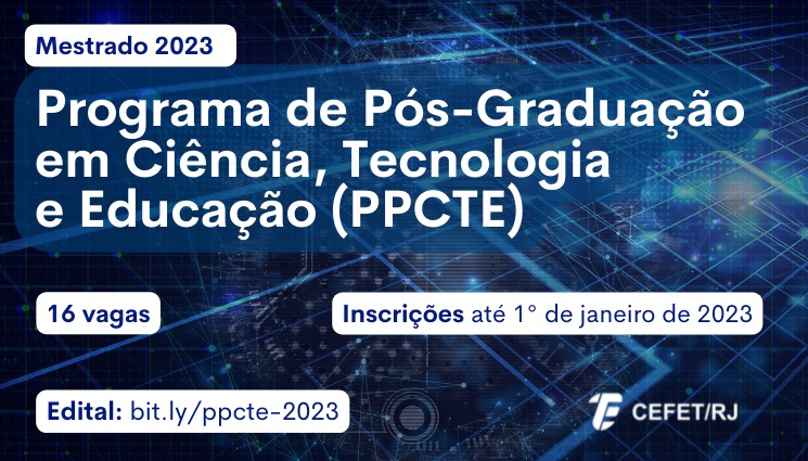 O Programa de Pós-Graduação em Ciência, Tecnologia e Educação (PPCTE) está com inscrições abertas até o dia 1º de janeiro para o curso de mestrado, com início previsto para o primeiro trimestre de 2023. Ao todo, o edital disponibiliza 16 vagas, distribuídas em quatro linhas de pesquisa, com reserva de parte delas pelo sistema de cotas.