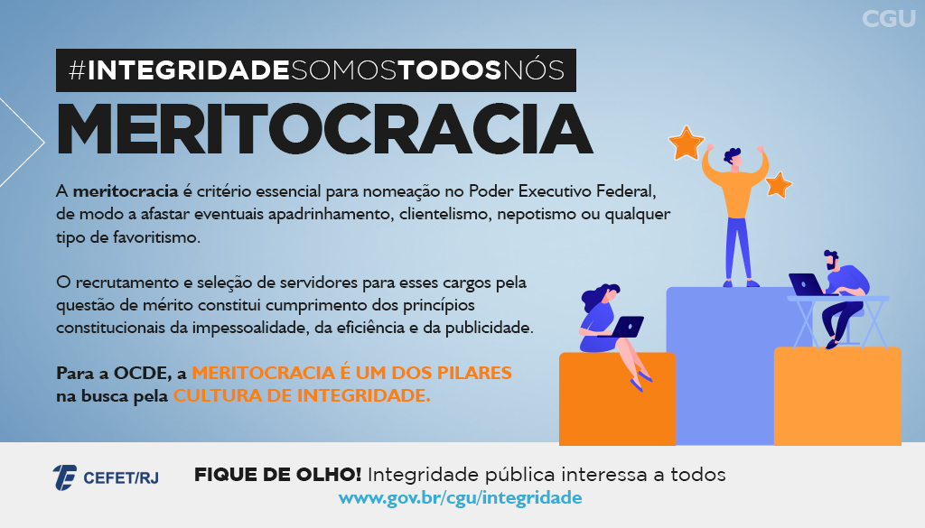 Para aprimorar os programas de integridade pública e promover essa cultura dentro dos órgãos e das entidades do Poder Executivo Federal, a Controladoria-Geral da União (CGU) lançou a campanha Integridade no Governo Federal, com a hashtag #INTEGRIDADESOMOSTODOSNÓS. Neste mês de dezembro, a campanha aborda o tema Meritocracia.