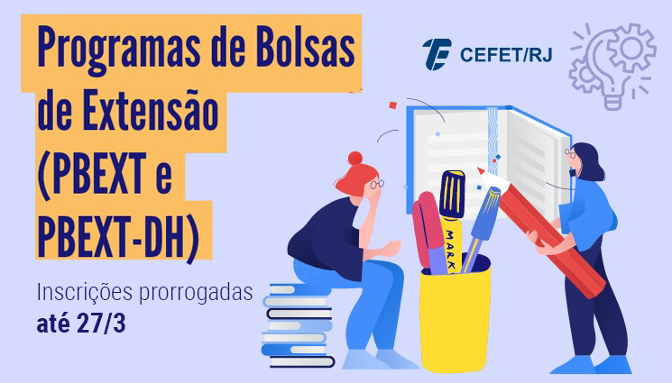 O Departamento de Extensão e Assuntos Comunitários (DEAC) do Cefet/RJ informa que prorrogou, até o dia 27/3 (segunda-feira), as inscrições on-line para os dois editais que visam selecionar projetos com concessão de bolsas pelo Programa de Bolsas de Extensão (PBEXT) e pelo Programa de Bolsas de Extensão para área de Direitos Humanos (PBEXT-DH). Podem concorrer às bolsas estudantes da educação profissional técnica de nível médio e dos cursos superiores da instituição.