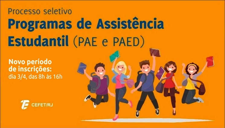 A Diretoria de Extensão (DIREX), por meio do Departamento de Extensão e Assuntos Comunitários (DEAC), informa sobre a prorrogação das inscrições para os Programas de Assistência Estudantil (PAE e PAED), em função da interrupção do processo causada pelas fortes chuvas ocorridas na cidade do Rio de Janeiro na noite do dia 30/3. Os candidatos de todas as unidades do Cefet/RJ que ainda não conseguiram se inscrever terão uma nova oportunidade no dia 3/4, das 8h às 16h (horário de Brasília), e o prazo para envio dos documentos se estenderá até as 16h do dia 4/4.