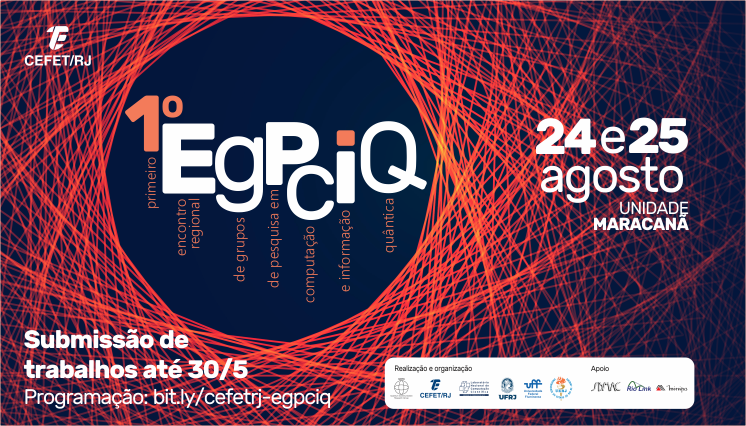 Nos dias 24 e 25 de agosto, o Cefet/RJ irá sediar o 1º Encontro Regional de Grupos de Pesquisa em Computação e Informação Quântica (1º EGPCIQ). Quem tiver interesse em participar pode submeter seus trabalhos até o dia 30 de maio pelo link que consta na página oficial do evento. O público-alvo é formado por pesquisadores, professores, alunos de graduação e pós-graduação dos cursos de Computação, Engenharia Elétrica, Física, Matemática, além de outros profissionais que se identificam com a área. As atividades irão ocorrer no Auditório 2 da Unidade Maracanã.