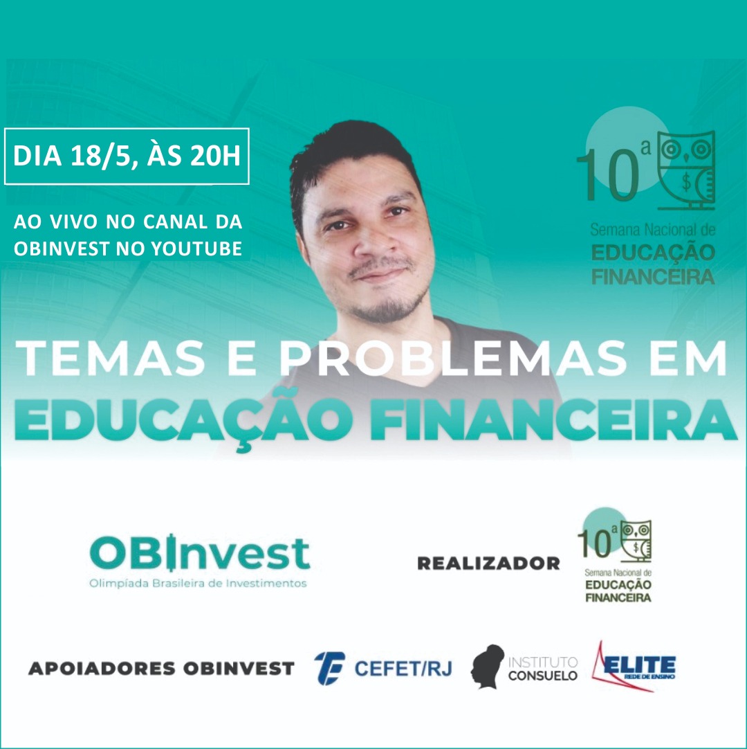 O projeto de extensão Olimpíada Brasileira de Investimentos (OBInvest) estará presente na programação da 10ª Semana Nacional de Educação Financeira, que está sendo realizada até o dia 21 de maio. A palestra “Temas e Problemas de Educação Financeira”, que será ministrada pelos docentes Gilberto Gil Passos e Wagner Dias, do Cefet/RJ, será transmitida ao vivo pelo canal da OBInvest no YouTube, no dia 18/5, às 20h.