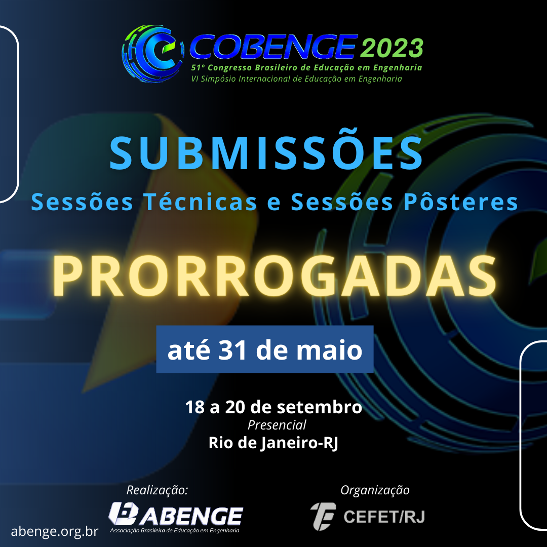 A Comissão Organizadora do 51º Congresso Brasileiro de Educação em Engenharia (COBENGE) informa que o prazo para submissão de trabalhos científicos para apresentação nas Sessões Técnicas (ST) e Sessões Pôsteres (SP) foi prorrogado até o dia 31 de maio.
