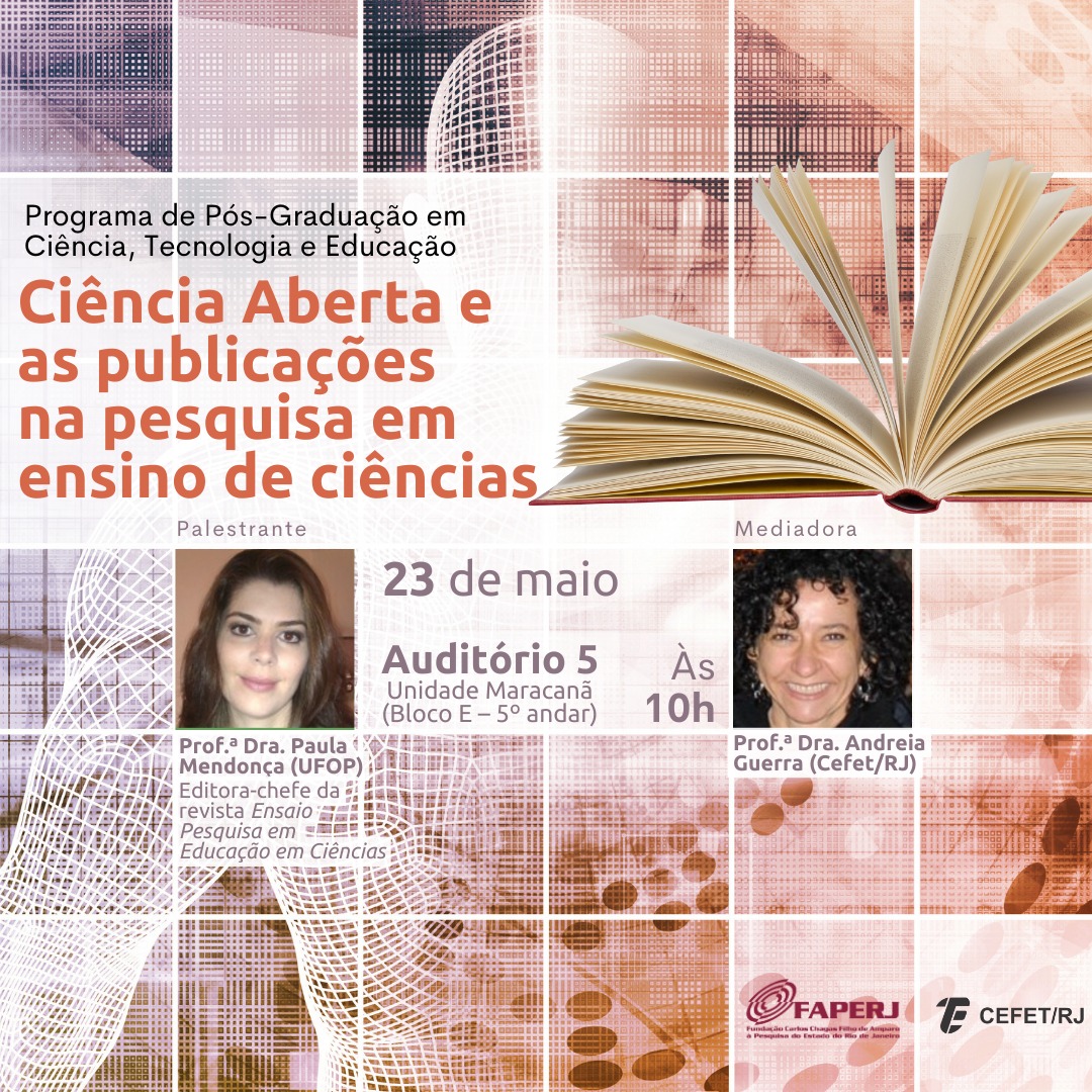 O encontro terá como palestrante Paula Mendonça, docente da Universidade Federal de Ouro Preto e editora-chefe da revista Ensaio Pesquisa em Educação em Ciências. A mediação será de Andreia Guerra, professora do Cefet/RJ.