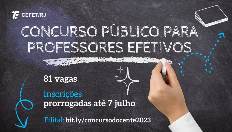 O Cefet/RJ torna público o edital que visa à contratação de professores efetivos. As inscrições iniciam nesta quarta-feira (7) e deverão ser realizadas até o dia 7 de julho, exclusivamente pela internet. A taxa de inscrição é de R$ 120 e os candidatos que tiverem direito à isenção do pagamento devem solicitar o benefício entre os dias 7 e 8 de junho. Ao todo, o processo seletivo oferta 81 vagas.