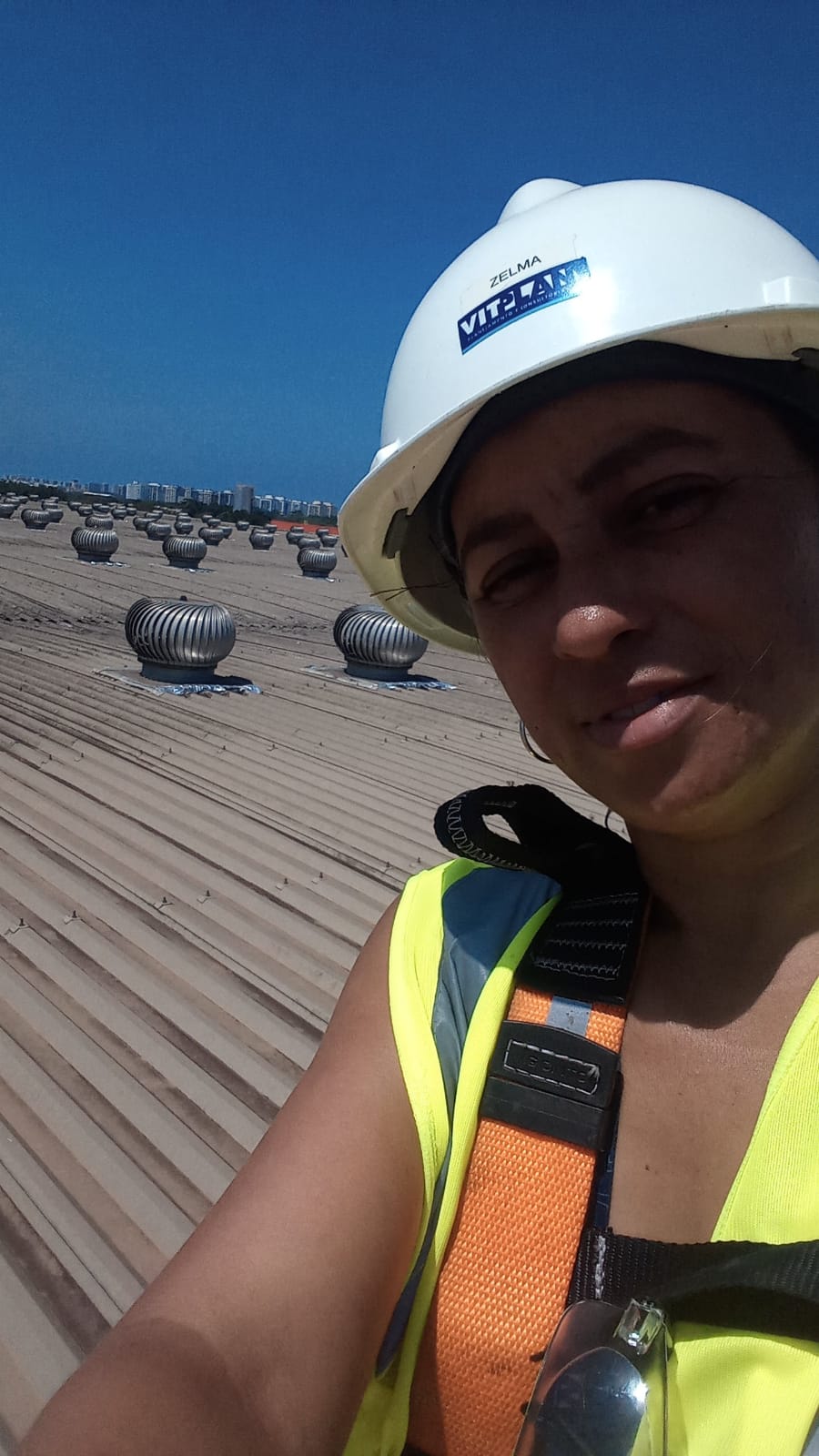 À esq., Leila da Costa acompanhando uma operação de içamento e retirada de telhados em sua primeira experiência na área de Segurança do Trabalho; à dir., Joselma Alves já atuando como técnica de Edificações na manutenção de calhas