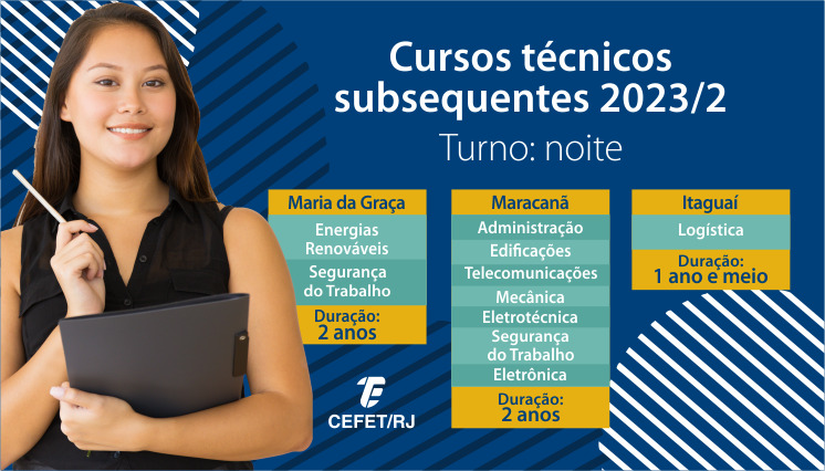 Além da abertura de vagas em sete cursos da Unidade Maracanã (Administração, Edificações, Eletrônica, Eletrotécnica, Mecânica, Segurança do Trabalho e Telecomunicações), o processo seletivo 2023.2 também tem oportunidades abertas para o curso de Logística, na Uned Itaguaí, e para os cursos de Energias Renováveis e Segurança do Trabalho, da Uned Maria da Graça.