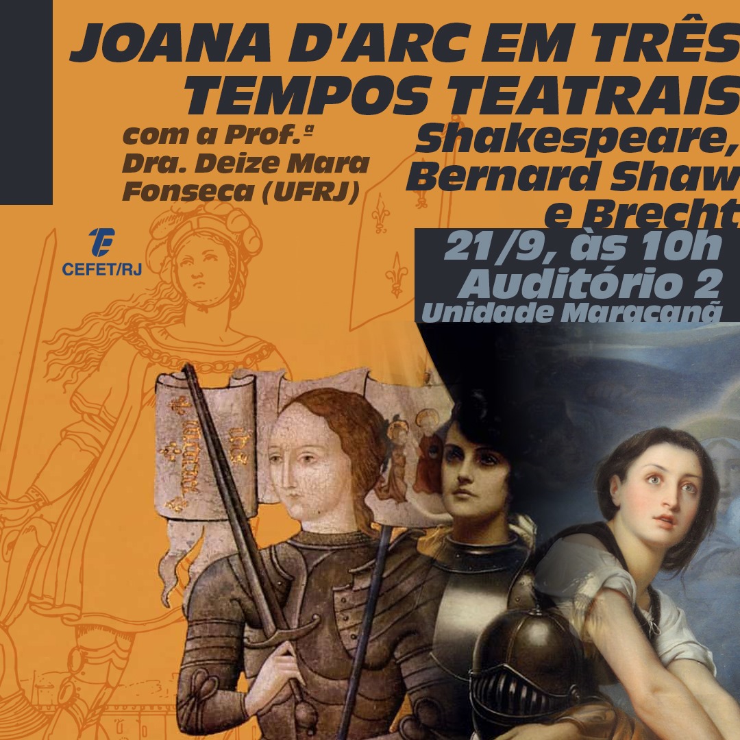 No dia 21 de setembro, o Cefet/RJ Unidade Maracanã irá receber a Prof.ª Dra. Deize Mara da Fonseca para ministrar a palestra “Joana d’Arc em três tempos teatrais: Shakespeare, Bernard Shaw e Brecht”. A partir de um diálogo intertextual, se buscará verificar como se deu a presença dessa figura mítico-histórica na dramaturgia europeia em três diferentes épocas. O evento é aberto ao público e será realizado às 10h, no Auditório 2.