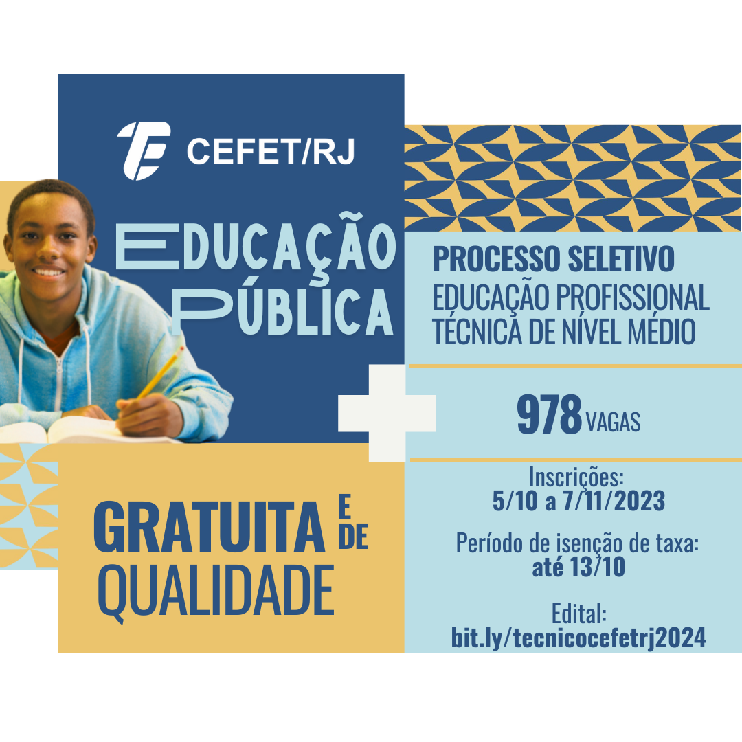 O Cefet/RJ torna pública a abertura do processo seletivo para ingresso nos cursos de educação técnica integrada ao ensino médio em 2024. O edital disponibiliza 978 vagas com oportunidades para ampla concorrência e oito modalidades de cotas. As inscrições já estão abertas e poderão ser realizadas até o dia 7 de novembro pelo site www.selecon.org.br. A taxa de inscrição é R$ 60 e os candidatos que tiverem direito à isenção de pagamento devem solicitar o benefício até o dia 13 de outubro.