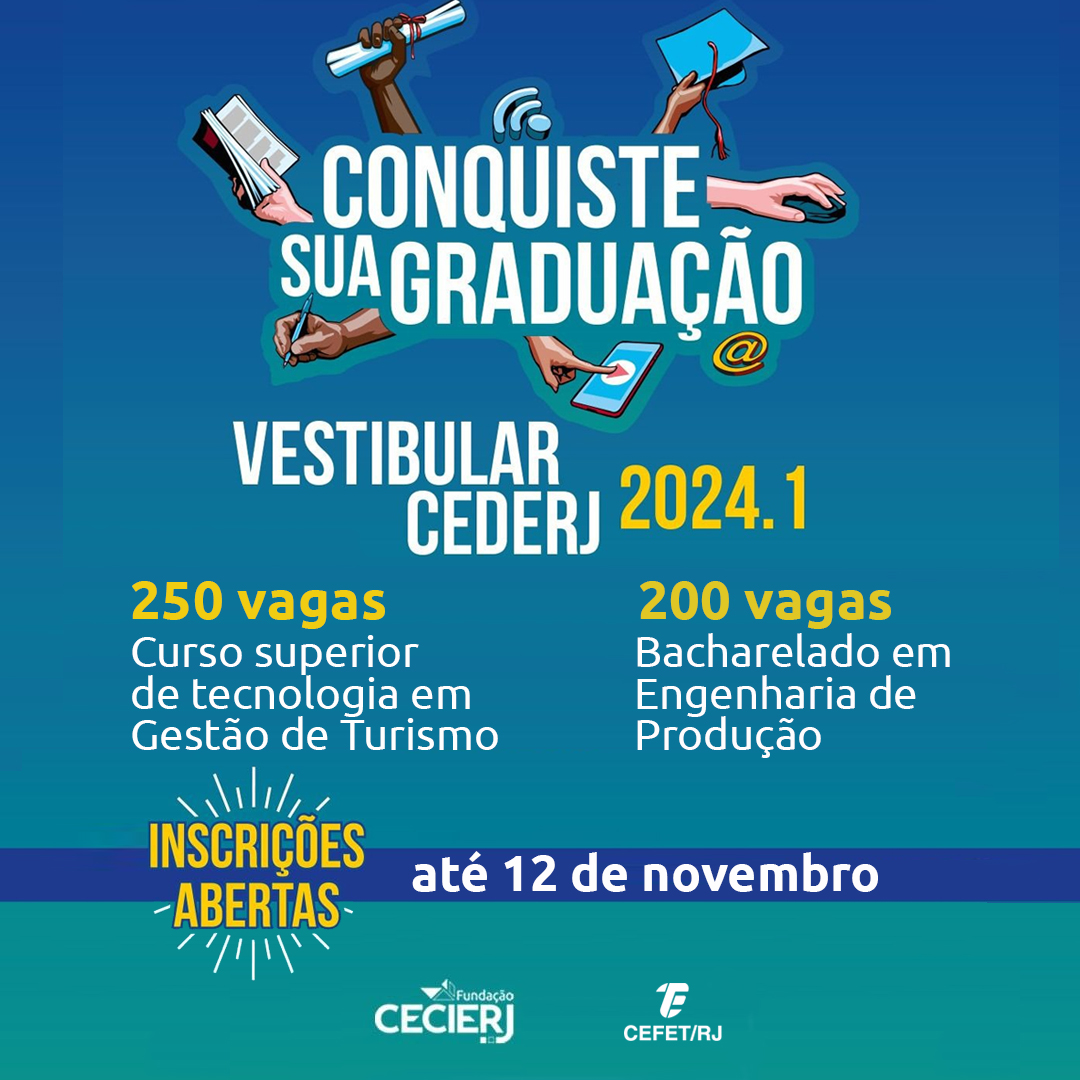 Neste certame, o Cefet/RJ oferta 450 vagas. São 250 para o curso superior de tecnologia em Gestão de Turismo e 200 para o bacharelado em Engenharia de Produção. As oportunidades estão distribuídas em diversos polos no estado do Rio de Janeiro e são referentes ao primeiro semestre de 2024.