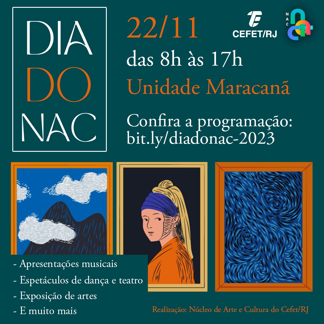 Com o objetivo de abrir espaço para a comunidade acadêmica apresentar seus trabalhos artísticos e artístico-acadêmicos, o Núcleo de Arte e Cultura do Cefet/RJ realizará o Dia do NAC. A ação acontecerá, principalmente, no dia 22 de novembro, das 8h às 17h, na Unidade Maracanã, mas também haverá outras atividades nos dias 23 e 29 de novembro. Na programação, estão previstas apresentações musicais, espetáculos de dança e teatro, exposição de artes visuais e diversas outras atrações. Não é necessário se inscrever.