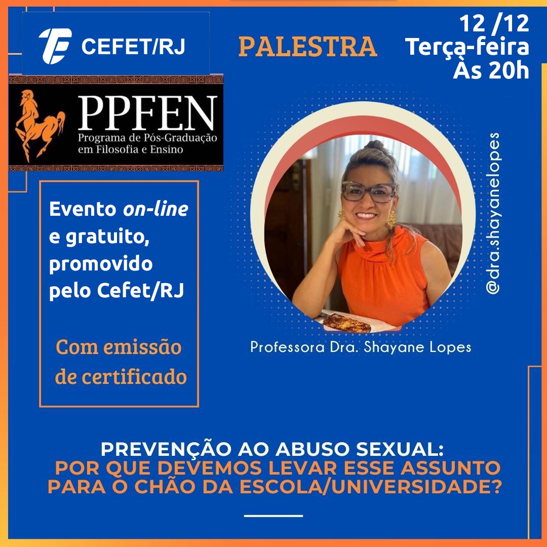 No dia 12 de dezembro, às 20h, o Programa de Pós-Graduação em Filosofia e Ensino (PPFEN) promoverá a palestra “Prevenção ao abuso sexual: por que devemos levar esse assunto para o chão da escola/universidade?”. O evento acontecerá de forma on-line e o link de transmissão será enviado às pessoas que se inscreverem em bit.ly/palestra-1212. Os participantes terão direito a certificado.