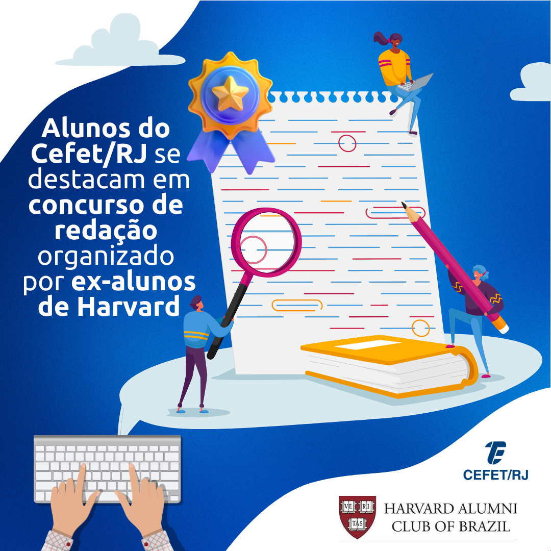 Três alunos do ensino médio do Cefet/RJ se destacaram no concurso de redação Harvard Book Prize Brasil, organizado pela Associação de Ex-Alunos da Universidade de Harvard, nos Estados Unidos. Ana Júlia da Cunha, do curso técnico em Administração da Uned Nova Friburgo, ficou em segundo lugar. Júlia Monteiro e Kauã Magalhães, do curso técnico em Eletrotécnica da Unidade Maracanã, conquistaram, respectivamente, a oitava e a 18ª colocação.