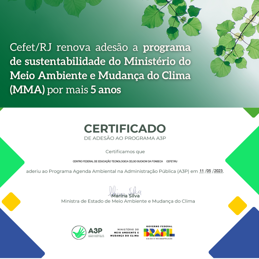 Neste mês de janeiro, o Cefet/RJ recebeu o certificado de adesão ao Programa Agenda Ambiental na Administração Pública (A3P), do Ministério do Meio Ambiente e Mudança do Clima (MMA). A renovação do compromisso, que existe desde 2018, aconteceu em maio do ano passado e foi divulgada no Diário Oficial da União. Com o novo acordo, válido por mais cinco anos, a instituição reforça o objetivo de incorporar a variável socioambiental no seu cotidiano e na qualidade de vida no ambiente de trabalho.