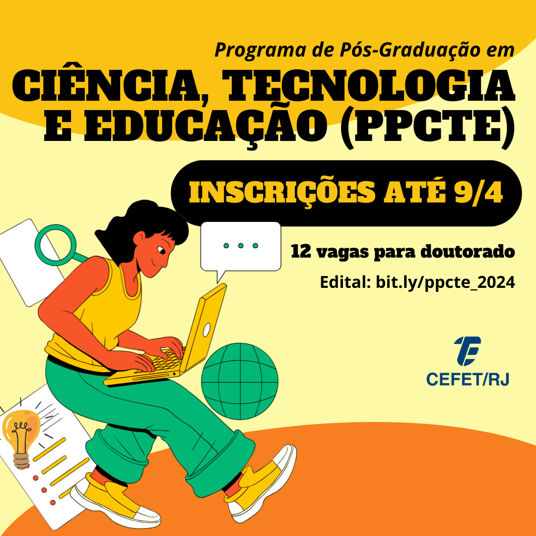 O Programa de Pós-Graduação em Ciência, Tecnologia e Educação (PPCTE) informa que as inscrições para curso de doutorado estão abertas até o dia 9/4. O edital prevê o preenchimento de 12 vagas para turmas com início no segundo e terceiro trimestres de 2024.