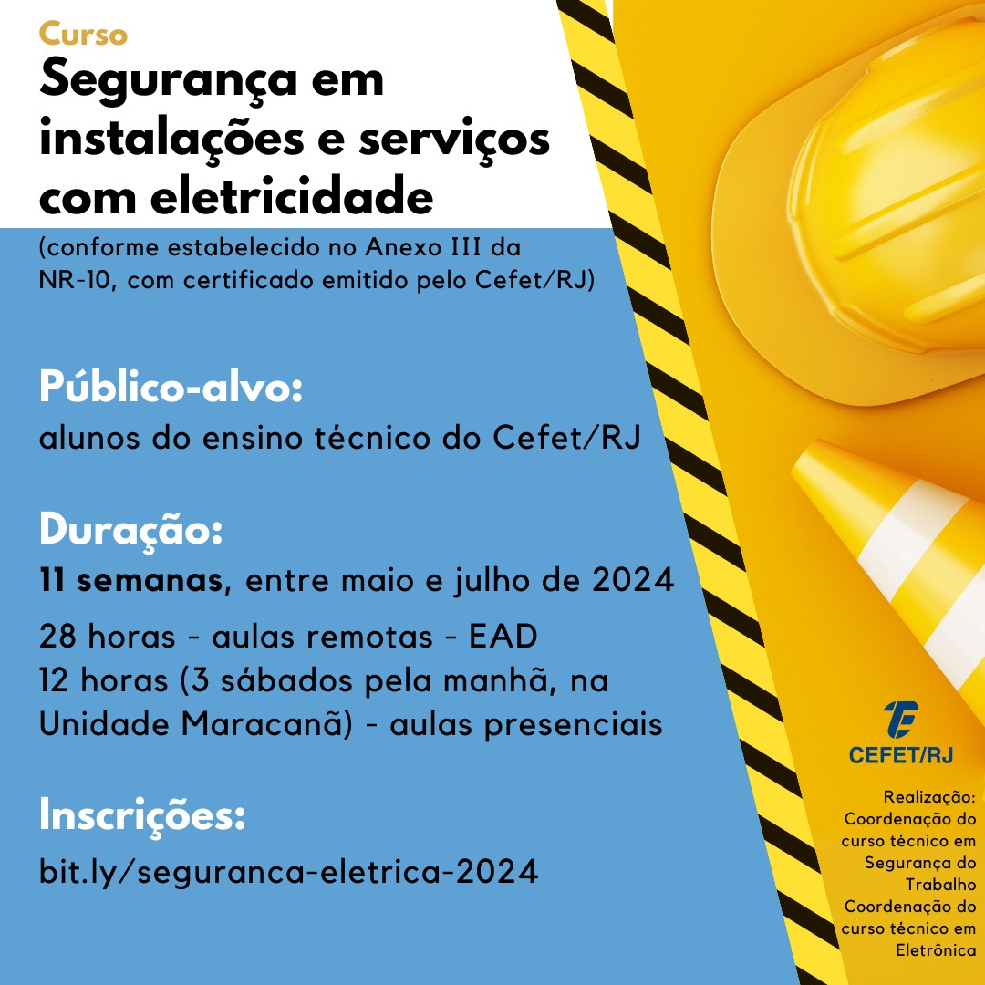 As coordenações dos cursos técnicos em Segurança do Trabalho e Eletrônica, da Unidade Maracanã, informam que estão abertas as inscrições para o curso “Segurança em instalações e serviços com eletricidade”. Os interessados devem preencher o formulário on-line até o dia 15 de abril. A oportunidade é destinada a alunos dos cursos técnicos de todas as unidades do Cefet/RJ (integrados ao ensino médio, concomitante ou subsequentes). As 40 vagas ofertadas serão preenchidas por ordem de inscrição e a expectativa é que uma outra turma seja aberta no segundo semestre.