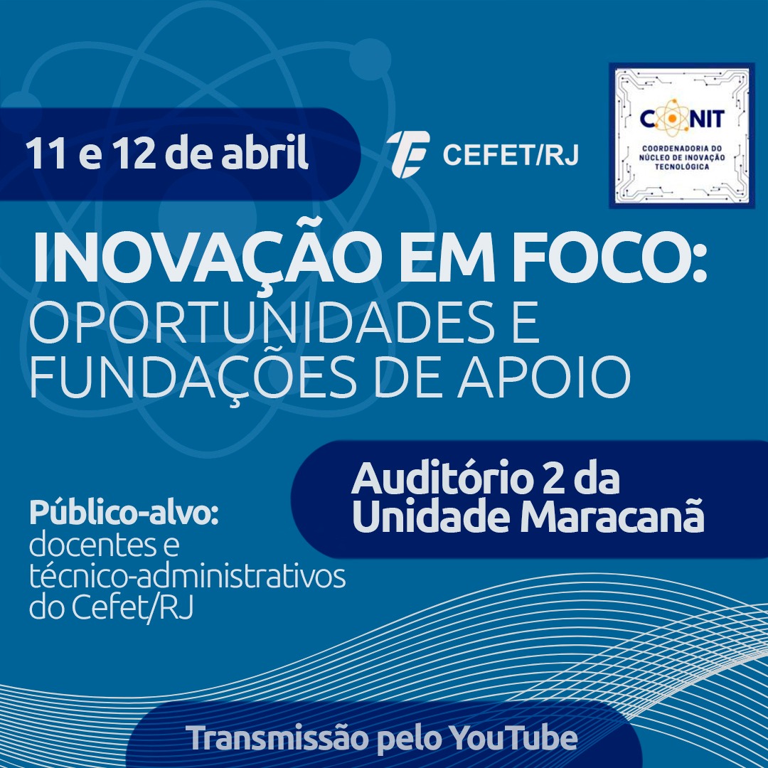 Nos dias 11 e 12 de abril, a Diretoria de Pesquisa e Pós-graduação (DIPPG), através do Departamento de Pesquisa (DEPEQ) e da Coordenadoria do Núcleo de Inovação Tecnológica (CONIT), realizará o evento “Inovação em foco: oportunidades e fundações de apoio”. A iniciativa é voltada a servidores docentes e técnico-administrativos do Cefet/RJ e tem como objetivo a divulgação de oportunidades nas tratativas com fundações de apoio. O encontro acontecerá no Auditório 2 da Unidade Maracanã e terá transmissão pelo canal do Cefet/RJ no YouTube.
