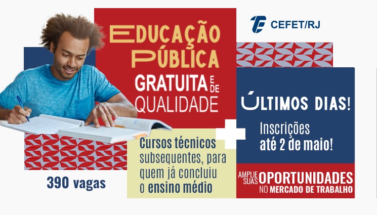 Termina na próxima semana, dia 2 de maio, o período de inscrições para o processo seletivo que visa ao preenchimento de 390 vagas em cursos técnicos subsequentes do Cefet/RJ, voltados a pessoas que já concluíram o ensino médio. Os interessados em concorrer à oportunidade devem preencher o formulário disponível no site www.selecon.org.br. A taxa de inscrição é de R$ 45.