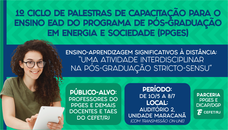 O Programa de Pós-graduação em Energia e Sociedade (PPGES), com apoio da Divisão de Capacitação e Desempenho do Departamento de Gestão de Pessoas (DICAP/DGP), irá promover o primeiro ciclo de palestras para capacitação em ensino à distância (EAD) do Cefet/RJ. Os encontros ocorrerão de maio a julho de 2024, no Auditório 2 da Unidade Maracanã, sob o tema central Ensino-aprendizagem significativos à distância: “uma atividade interdisciplinar na pós-graduação stricto-sensu”. O PPGES é a primeira pós-graduação stricto sensu do Brasil, aprovada pela CAPES em fevereiro deste ano.