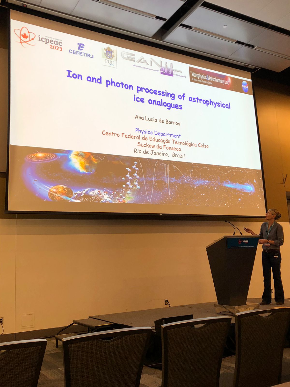 Professora Ana Barros apresentando trabalho em conferência internacional em 2023