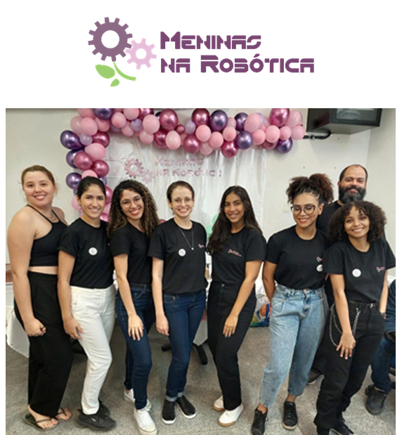 Parte da equipe de alunas do projeto Meninas na Robótica com a professora Rafaelli Coutinho e o professor Fabricio Lopes (coordenadores do projeto)