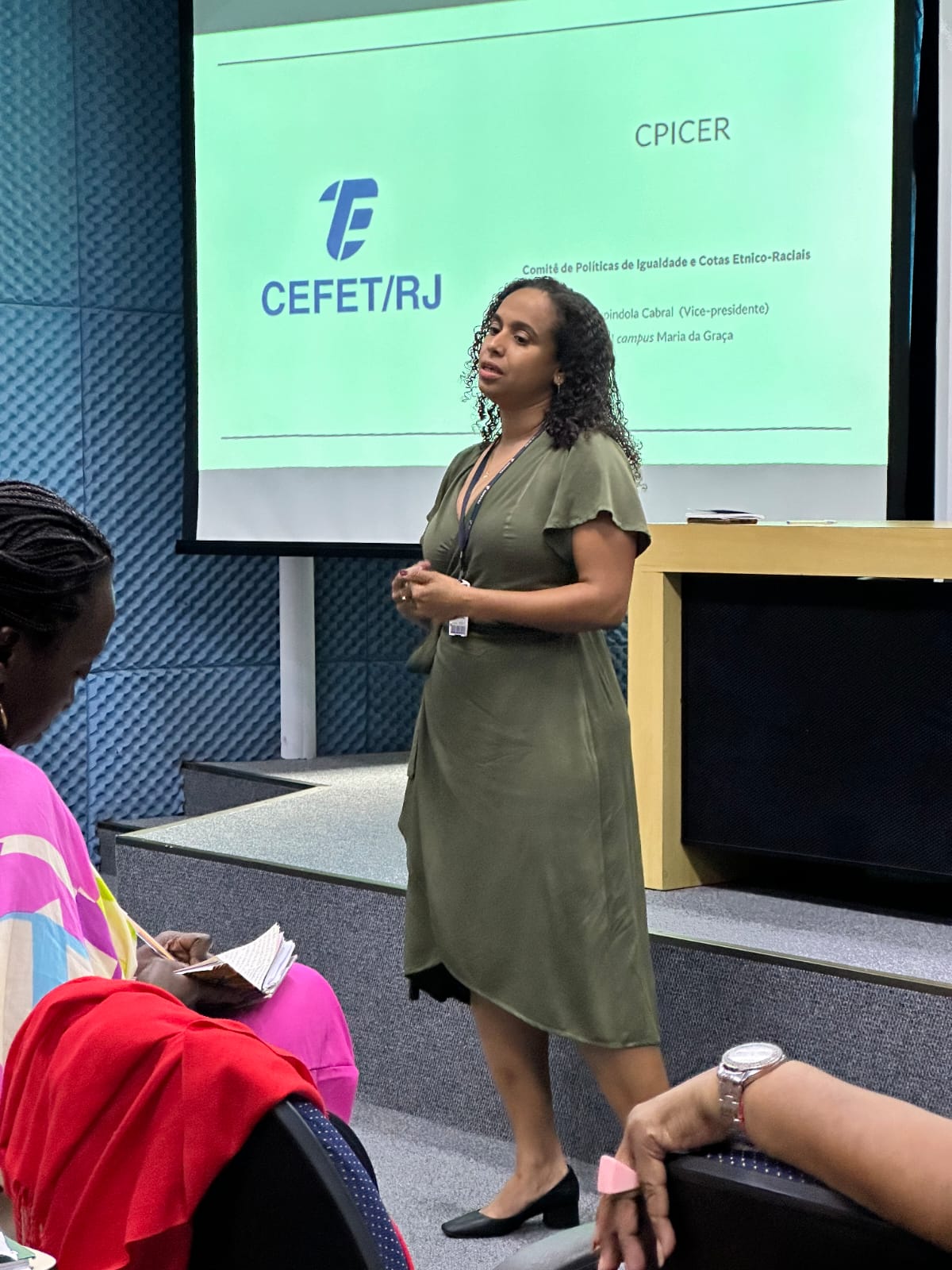 Vice-presidente do Comitê de Políticas de Igualdade e Cotas Étnico Raciais do Cefet/RJ durante apresentação no painel