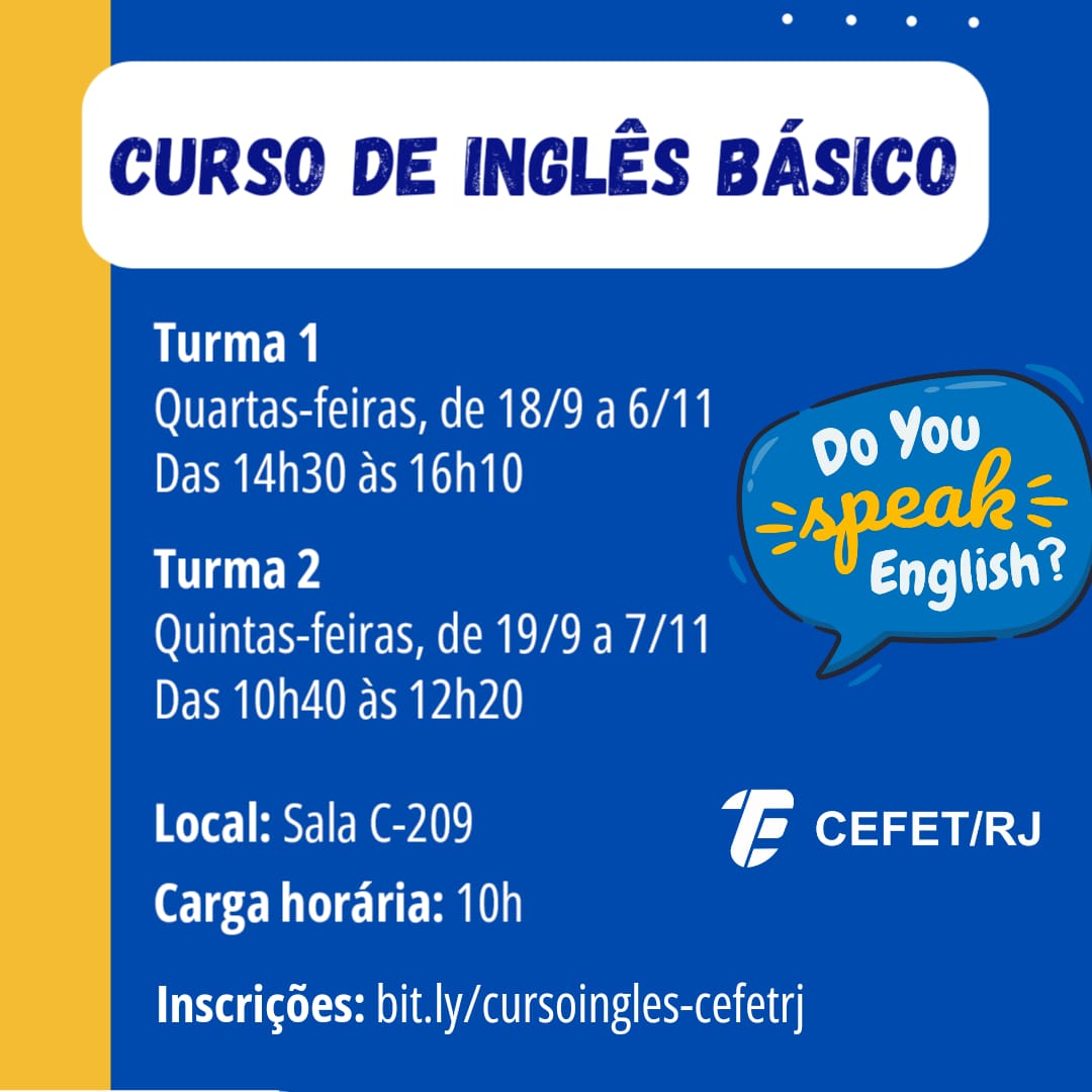 O Cefet/RJ promoverá um minicurso de inglês para os alunos do técnico integrado ao ensino médio. A iniciativa, organizada pela Coordenação de Línguas Estrangeiras e pelo projeto de extensão CEFET Sem Fronteiras, tem o objetivo de focar no ensino de conteúdos básicos da língua inglesa para estudantes que têm interesse ou precisam desse conhecimento, especialmente os que desejam cursar faculdade fora do país.